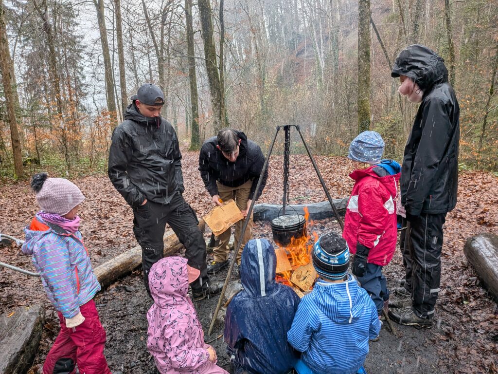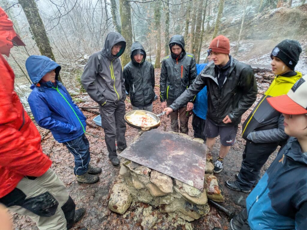 Heute haben die Stufen Sputnik und Zambra trotz Regen, Schnee und Kälte einen coolen Nachmittag im Wald verbracht. Wir haben Popcorn über dem Feuer gemacht, was super fein war. Natürlich haben wir auch Spiele gespielt, um uns bei den Temperaturen warm zu halten.